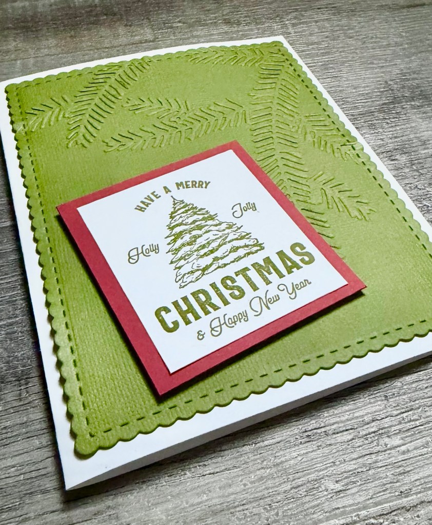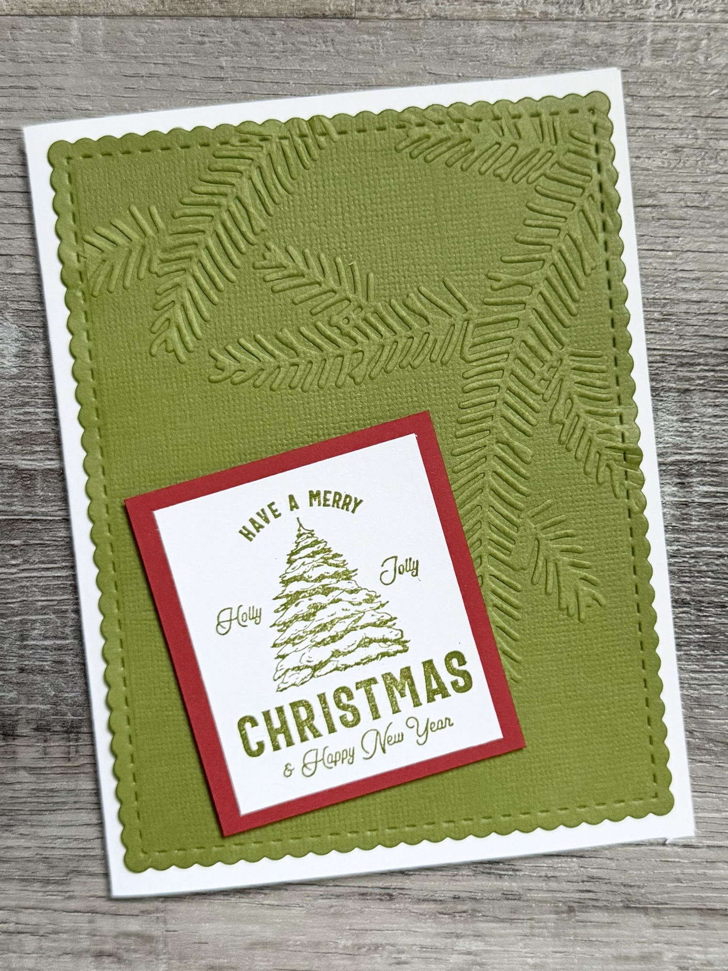 I embossed a piece of green card stock using a pine bough embossing folder (similar to this). Then using these Scallops & Rectangles Nesting Dies, I die cut the piece. I attached it to a white card and then attached the stamped piece to the card using foam tape.