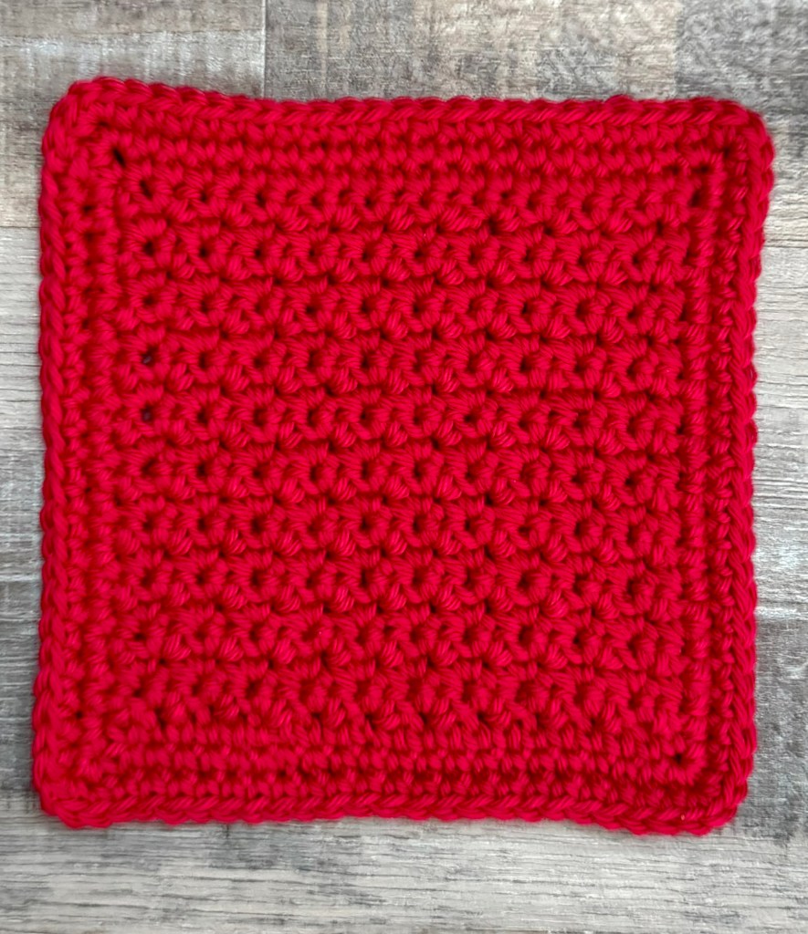 Finished dishcloth measures about 6.25 by 6.25 inches.