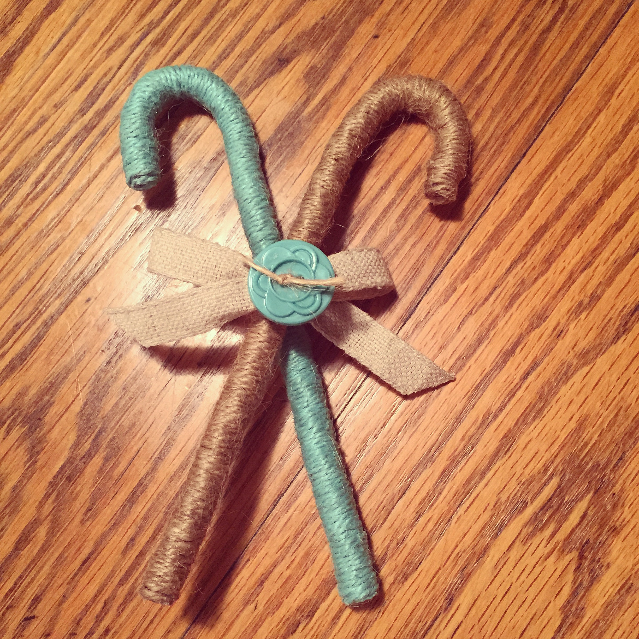 I started by putting a strong glue that dries clear (I like Crafter’s Pick) on the bottom of the candy cane. I wound the twine into a tiny circle (no need to cut the twine, you can just continue wrapping from here), glued it to the bottom of the candy cane, and held it there for a couple of minutes to dry. Then I added a little more glue up the sides of the candy cane and just started wrapping the twine tightly around the candy cane. Continue wrapping around the curve to the other end. I added glue on the sides near the end to keep the twine in place. Finish the wrapping by making another tiny circle and glue it in place on the end. Before tying the wrapped candy canes with linen ribbon, I added a drop or two of glue to hold them together. I tied a turquoise button with natural twine and glued it to the center of the bow