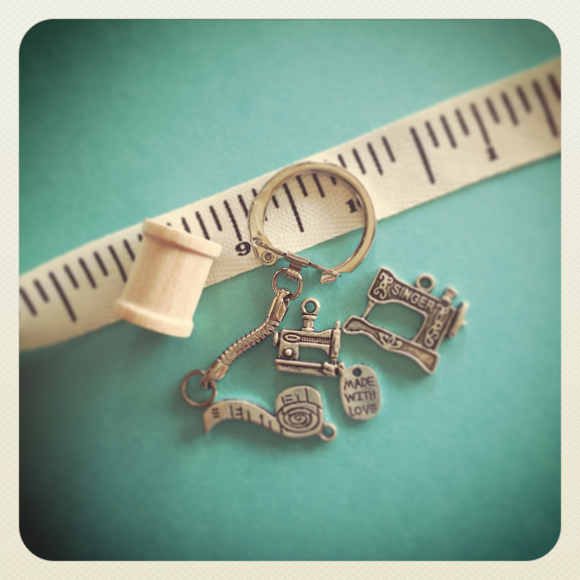 I got these locking key chains from Amazon. The wooden spools are 3/4-inch tall and available at Michaels and Hobby Lobby or your local craft store. This key ring is a sewing theme (I also included a tiny key charm) and I found this great ruler ribbon at Hobby Lobby.