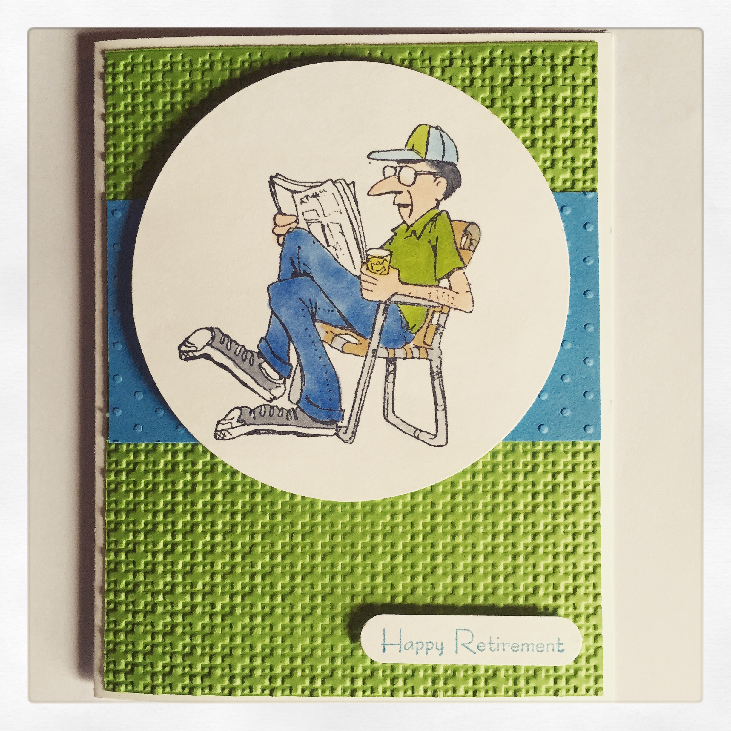 This is an old stamp from Visual Image Printing ~ not sure the company is even around any more. The “Happy Retirement” stamp, square lattice embossing folder, and word label punch are all from Stampin’ Up. The dot embossing folder is from Cuttlebug. The 3 1/2-inch circle punch is from Marvy Unchida.