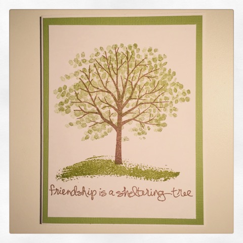 First I stamped the grass in olive ink on white card stock. The tree is then stamped with brown ink. The leaves are stamped twice; once in olive ink and a second time in celery ink. You can get the same effect by stamping once in olive ink and then stamping again without reinking your stamp. Finally, the sentiment is stamped with brown ink. I trimmed the stamped image, attached it to green card stock, and attached the panel to a white card.
