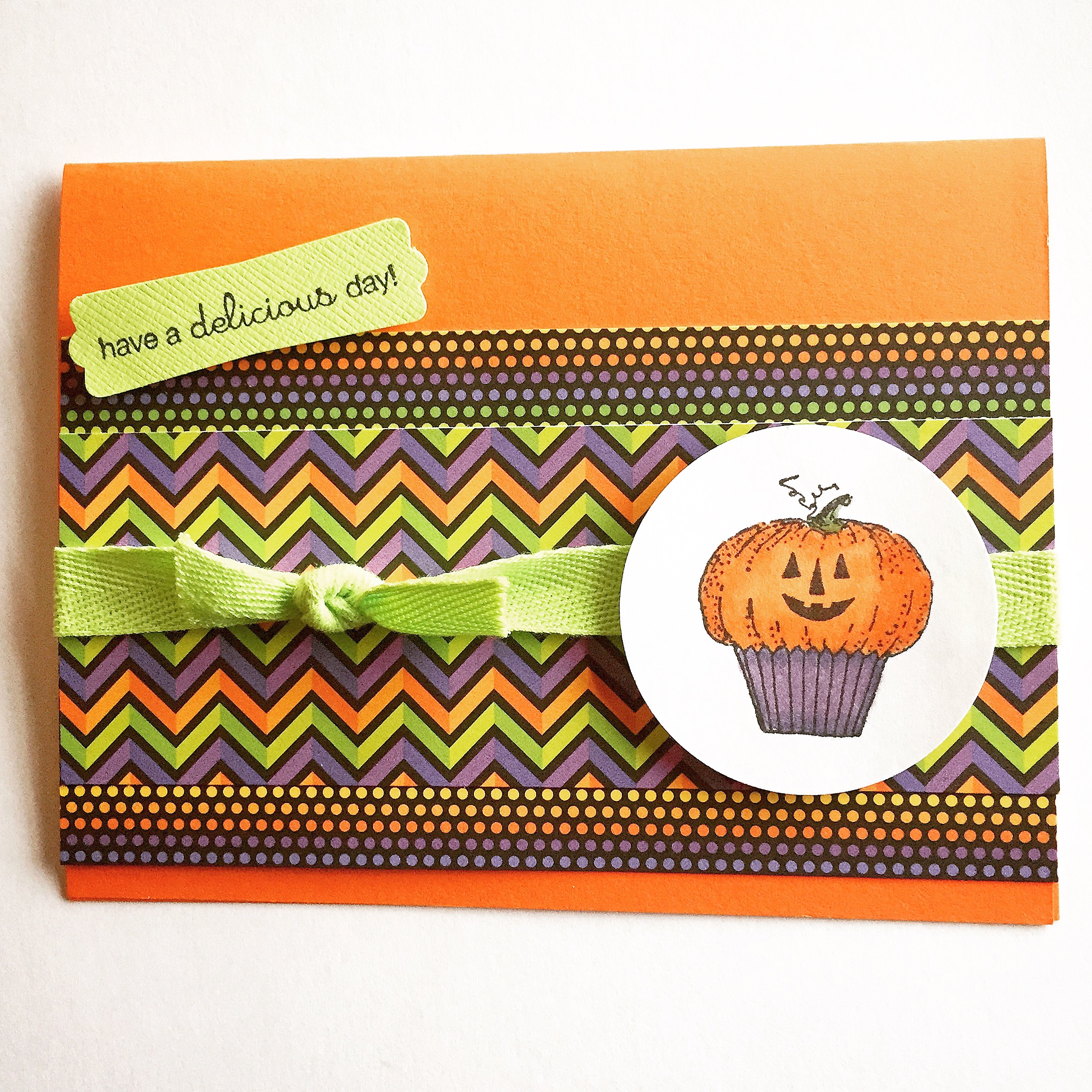 When I saw this adorable stamp by Karen Lockhart I just knew it had to come home with me! You can find your very own Pumpkin Cupcake stamp here at Pink Ink Stamp Company. The stamp “have a delicious day” is from A Muse Studio and worked perfectly for this card.