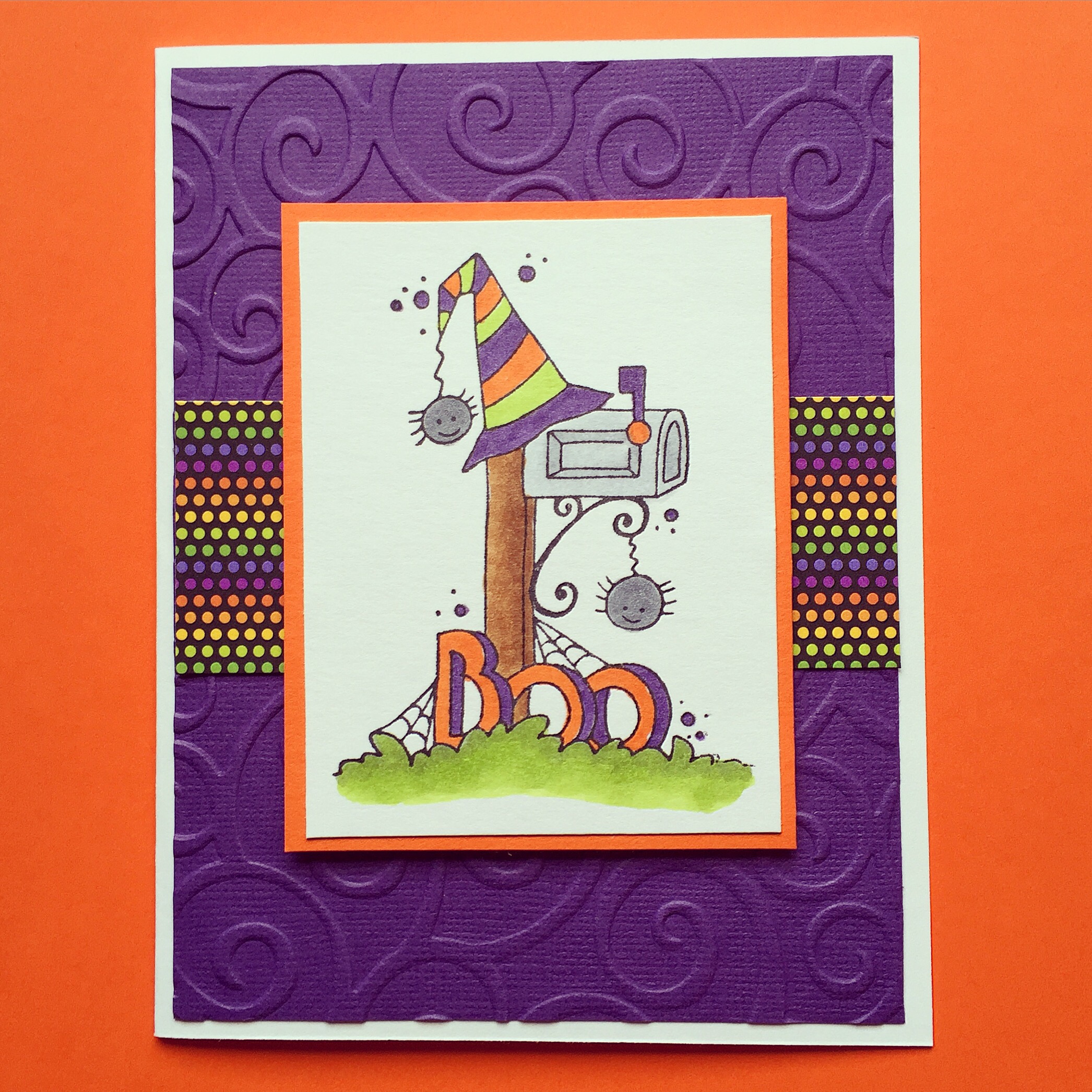 The image is stamped on white card stock with black ink, colored with Copic markers, and layered to orange card stock. Using the swirl embossing folder from Cuttlebug, I embossed a panel of purple card stock and attached it to a white card. I added a strip of patterned paper and then attached the stamped image with pop dots.Β