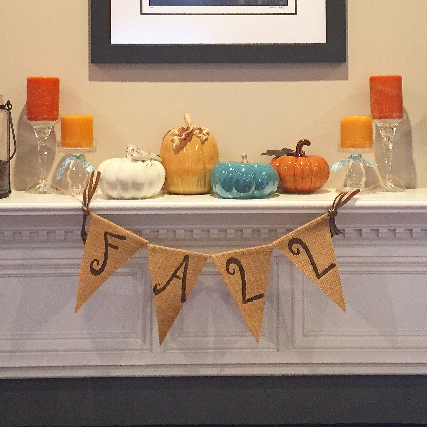 I shared some Fall Subway Art here a few days ago that I use to decorate my mantel. I also made a fun “FALL” burlap banner to hang across the front of my fireplace.