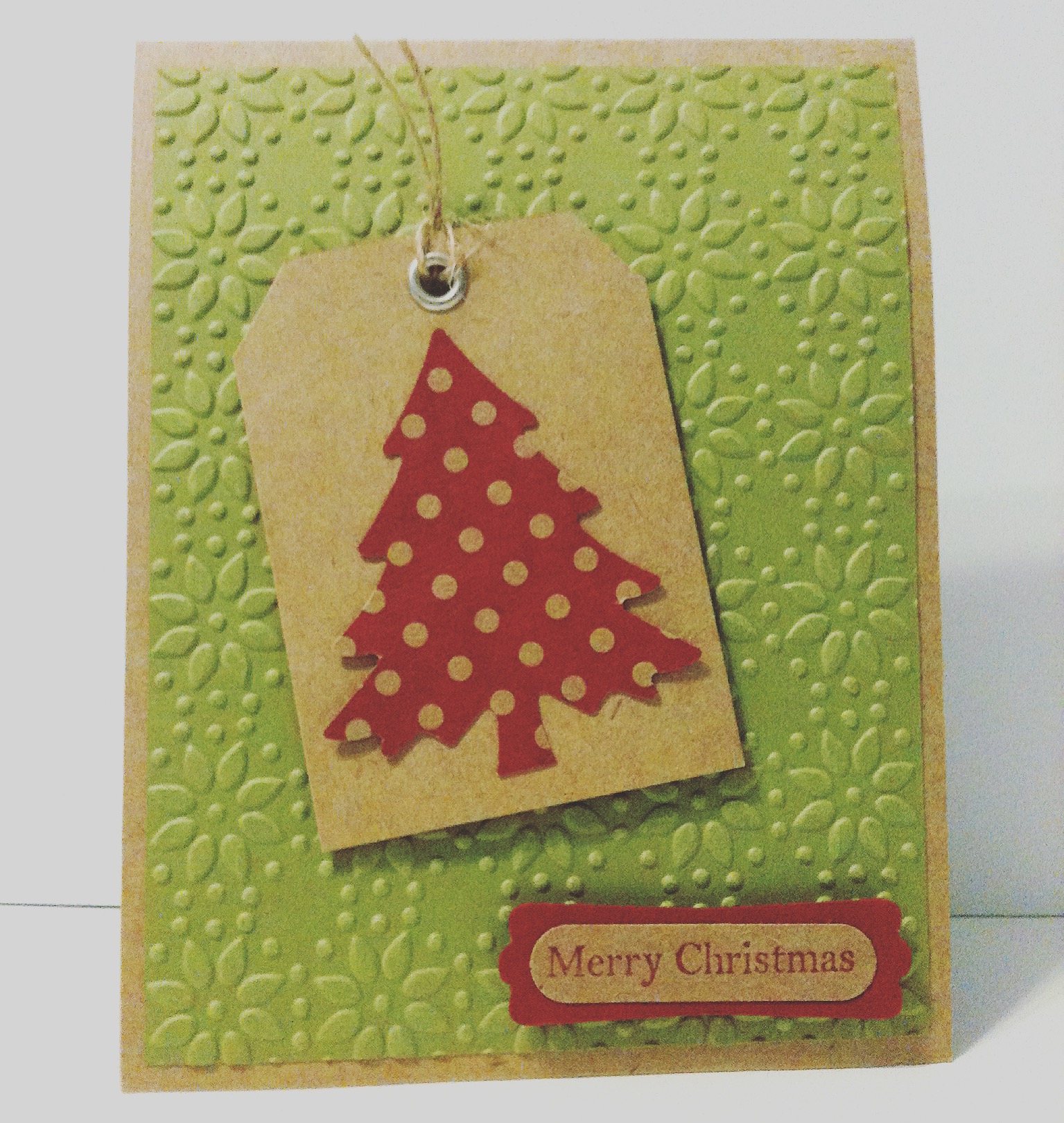 I embossed a panel of green card stock with the poinsettia embossing folder and attached it to a kraft card. I cut a tag from kraft card stock (I used a tag I already had as a template), set a silver eyelet in the top, and tied it with a small piece of twine. I punched a tree from red polka dotted card stock and attached it to the tag. The tag is then put on the card with pop dots. I stamped Merry Christmas with red ink on kraft card stock, punched it with the word label punch, and attached it to a label punched from red card stock. The label is attached with pop dots.