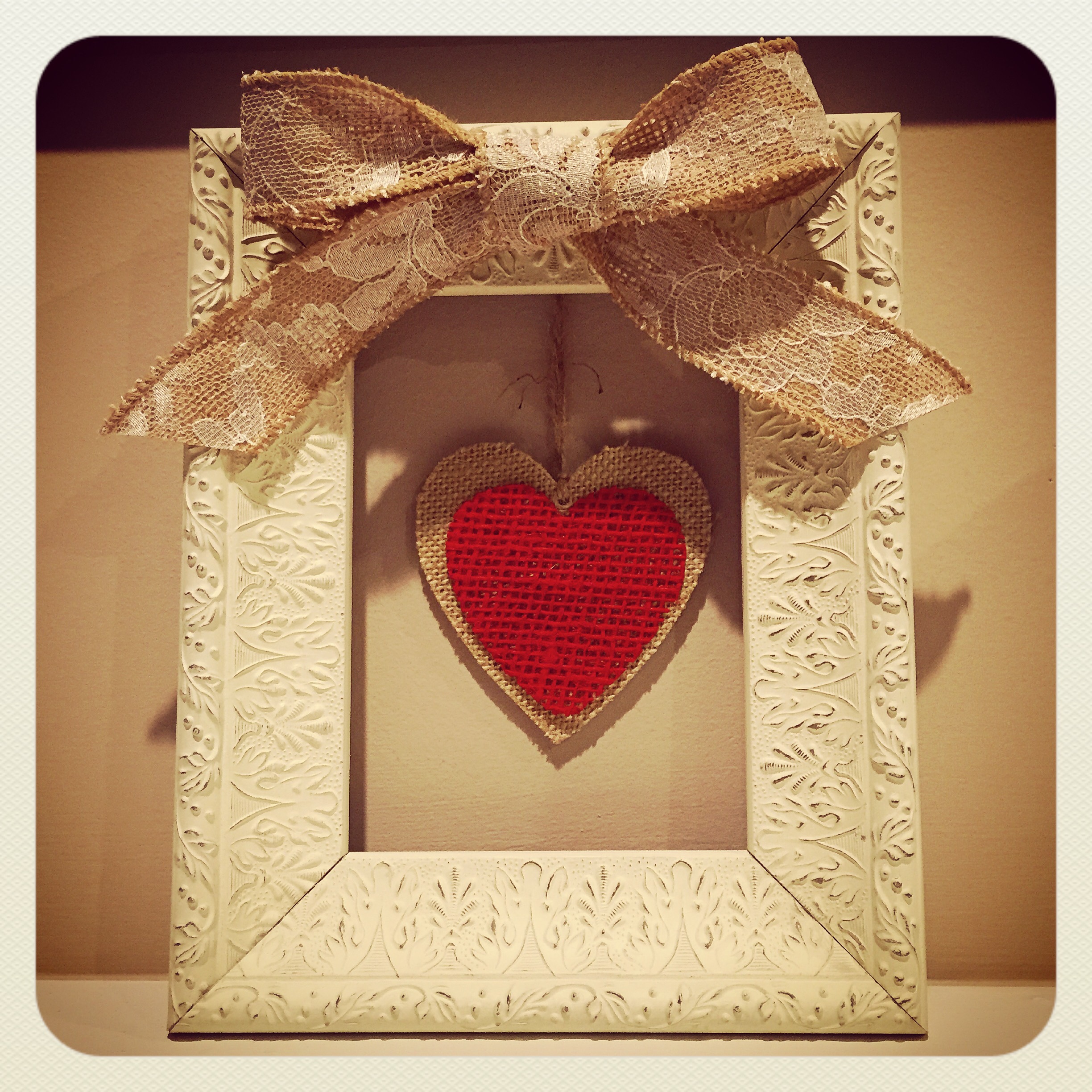 You will need an open back frame of your choice. My frame actually had an easel back on it, but I was able to remove it with my trusty exacto knife. The brown burlap heart ornament (complete with hanging twine) came from Hobby Lobby. The red burlap heart (came in a package of 6) and the burlap lace ribbon are also from Hobby Lobby.