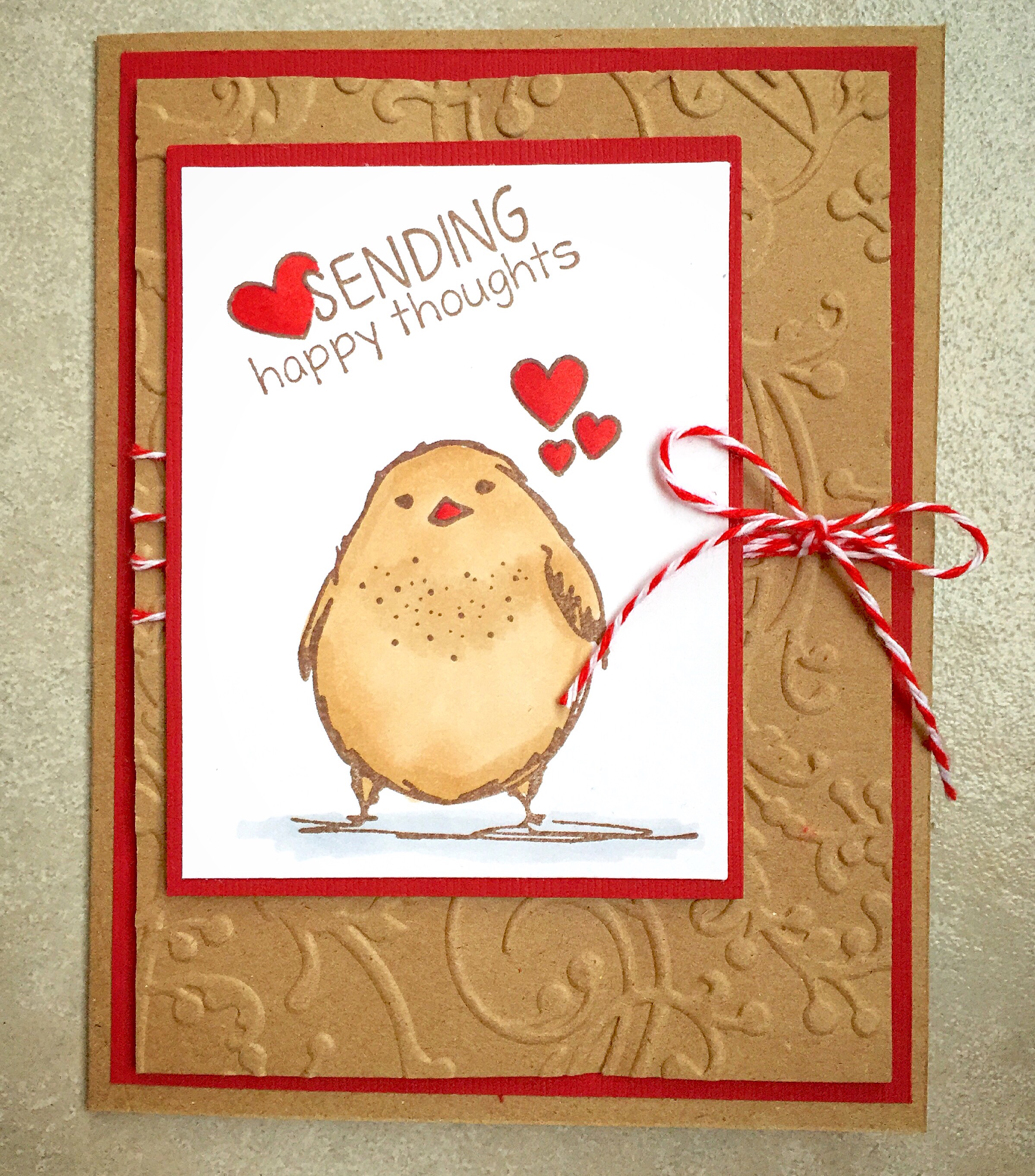 I stamped the bird and sentiment with brown ink on white card stock. The image is colored with Copic markers and layered to red card stock. I embossed a panel of kraft card stock with the vine embossing folder from Sizzix. I wrapped the panel with red and white baker’s twine, tying a bow on the right side. Then the panel is layered to red card stock and attached to a kraft card. The stamped panel is attached with foam tape over the twine.