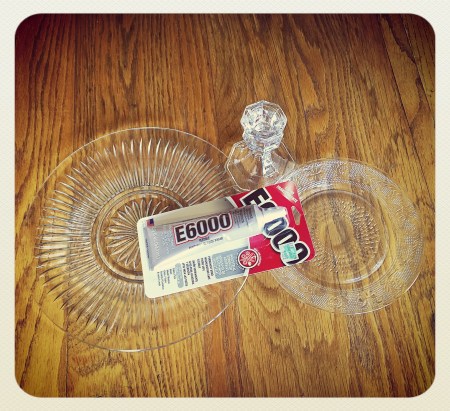 Once you’ve chosen your plates, all you need are glass candlesticks and E6000 adhesive. Make sure to get the clear adhesive – it also comes in white and black so check the package! I picked mine up at Hobby Lobby (using my coupon, of course!).