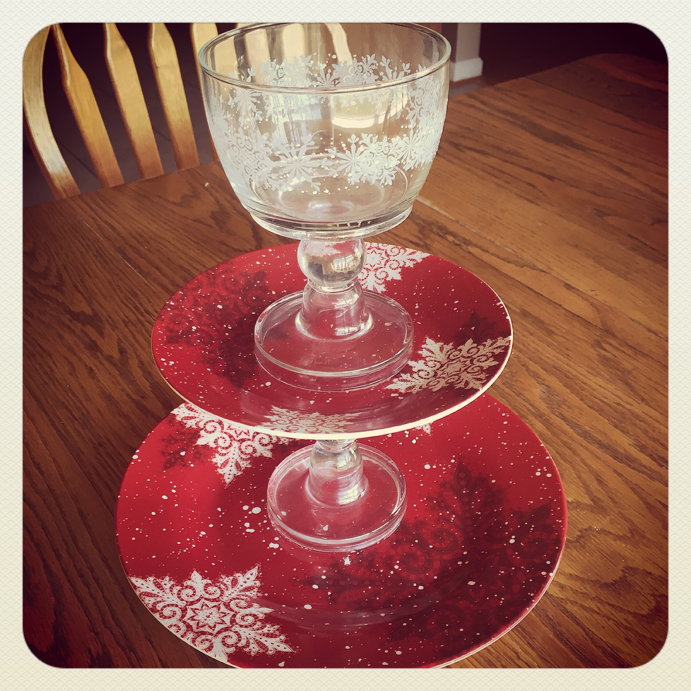 To assemble the serving dish, put a thin bead of adhesive on the bottom of the candlestick. Center it over the large plate (I just eyeballed this) and press the candlestick to the plate. Use a damp cloth to wipe up any adhesive that squeezes out. Then apply adhesive to the top of the candlestick and attach the small plate. Let dry for several hours and you have your very own, one of a kind serving piece! I always hand wash my serving dishes – I’m not sure how they would do in the dishwasher. They do hold up very well, though. I’ve had the Christmas one pictured below for several years. I even store it in a cabinet in the garage…in the Alabama heat…and it is still as good as the day I made it :).