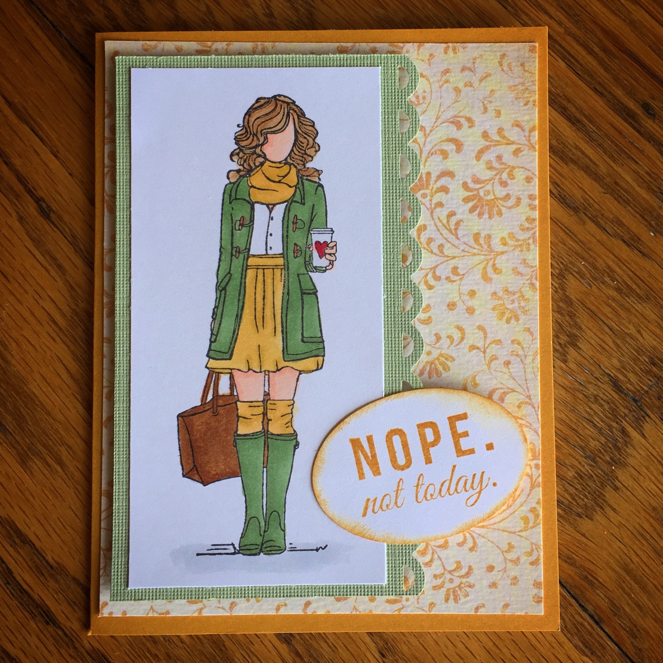 Here’s a card I made using the “Tricia Girl” set from Unity Stamp Company. I love that she’s just a little sassy. She’s not going to let things get her down…Nope. Not Today.
