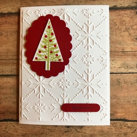 The stamps are from the Festival of Trees set by Stampin’ Up and the embossing folder is from Sizzix. The tree and label punches are also from Stampin’ Up. The scalloped oval punch is from Marvy Uchida. Companies are constantly changing their products, so if you can’t find the specific stamp or punch just look for something similar – or look in your stash and use what you already have. ๐