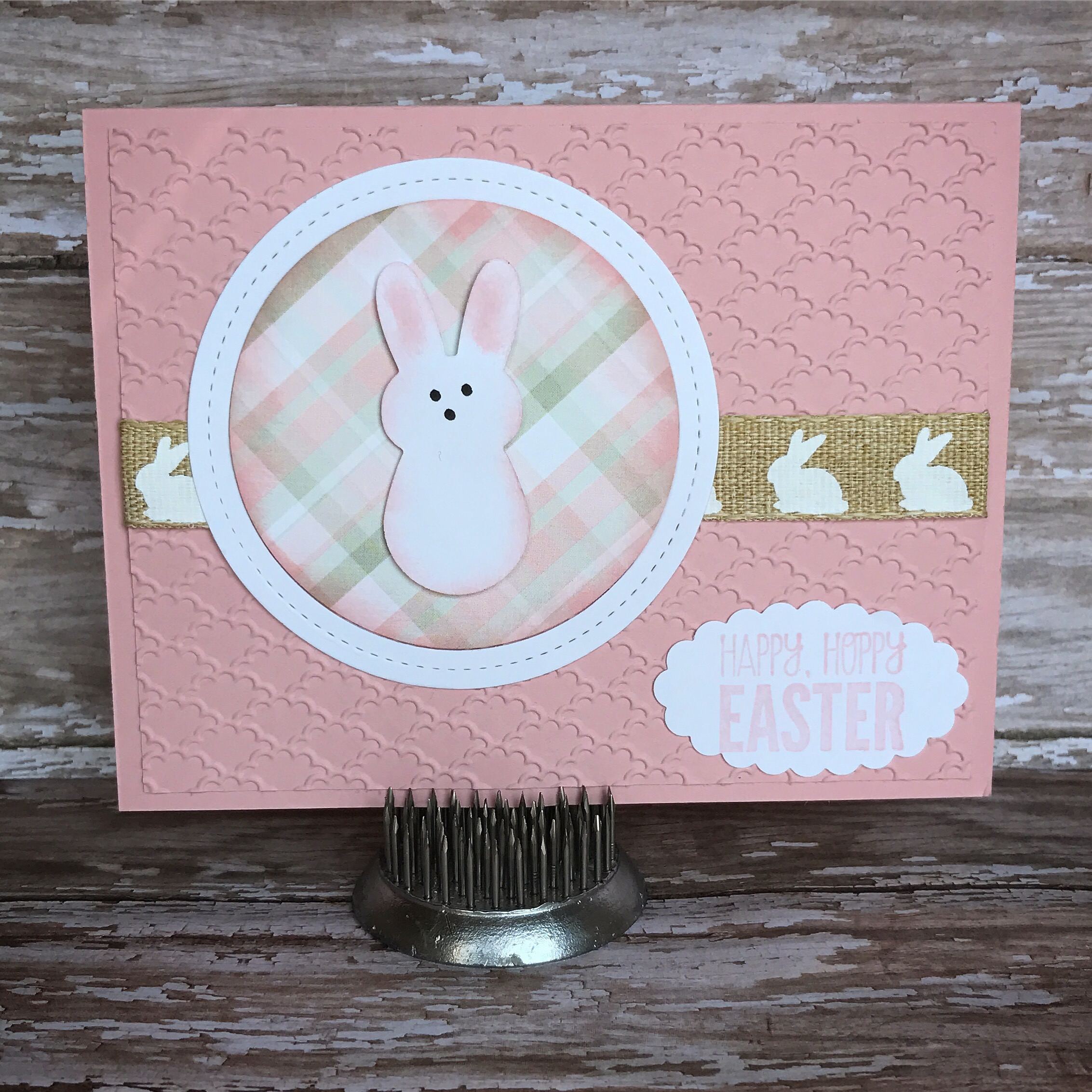 Emboss a panel of pink card stock with the embossing folder. Attach the ribbon and then attach the piece to a pink card. Attach the white circle frame to the card. Add the patterned paper circle to the card with foam tape. Attach the bunny to the circle with foam tape. Stamp the sentiment with pink ink on white card stock. Punch with a scalloped oval punch and attach to the card.