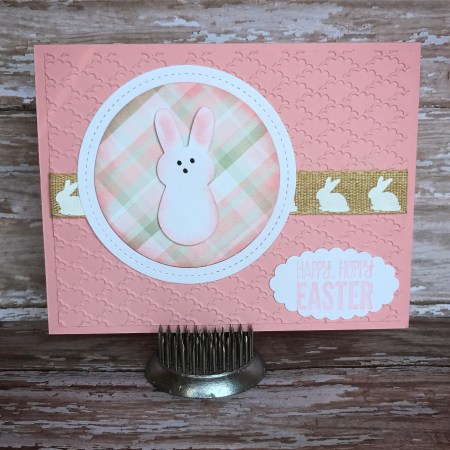The embossing folder and sentiment stamp are from Stampin’ Up (sadly both are discontinued). The bunny is also a discontinued die from A Muse Studio. The Stitched Circle Frame is from My Favorite Things. Companies change their products often – discontinuing some things so they can add new things. Get creative and use what you have!!
