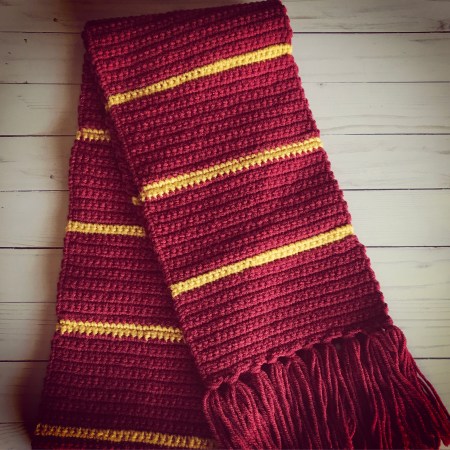 I wanted to make her a little something special and, since she is a huge Harry Potter fan, what could be better than a scarf made in Gryffindor colors?