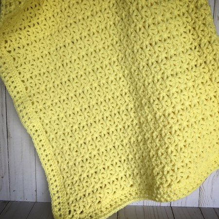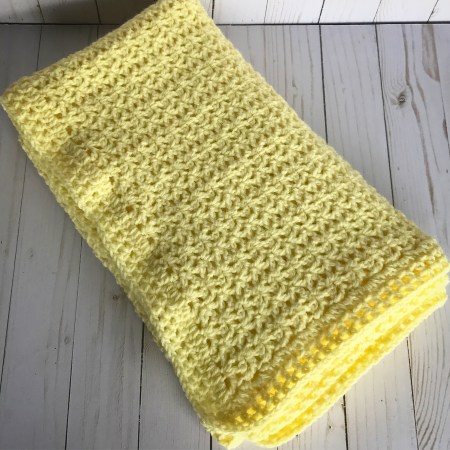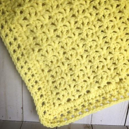This has been my go to pattern whenever I need to crochet a quick baby blanket. It works up very quickly using worsted weight yarn in a simple v-stitch. Any soft yarn works great. I used Lion Brand Pound of Love in Pastel Yellow to make this one. The pattern is in this booklet Crocheted Layettes for Baby from Leisure Arts. It’s a really old booklet and I was happy to see that it is still available from Amazon!! Click the link above if you’re interested in getting your very own copy. 🙂