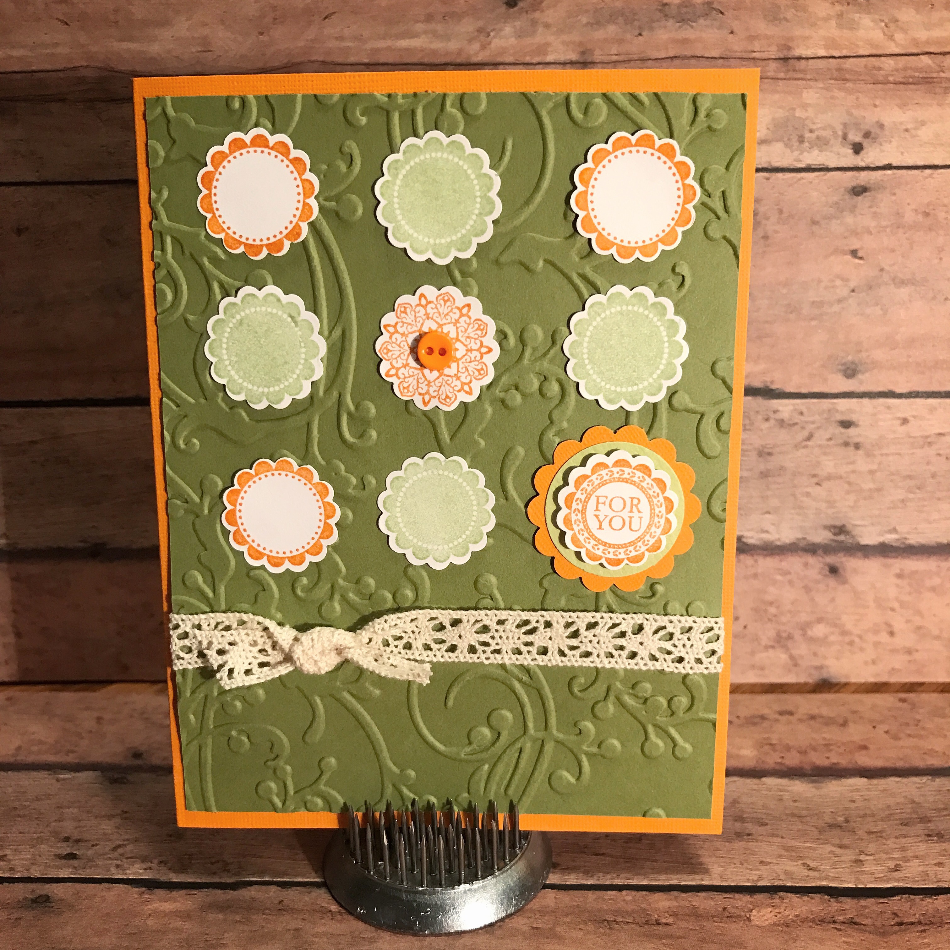 I embossed a panel of green card stock, tied it with lace ribbon, and attached it to an orange card. I stamped 5 flowers with orange ink and 4 with green ink on white card stock. I punched them out and attached all but 1 orange flower to the card. For the last flower, I punched a larger scalloped circle from orange card stock and layered a small green card stock circle to the center. The orange flower is then attached with foam tape. To finish the card, I added a tiny orange button to the middle flower.