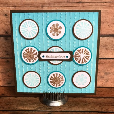 To make the card base, take a piece of 12 x 12 inch card stock, trim it to 5.5 x 11 inches, and fold in half. Emboss a piece of turquoise card stock that has a white core. Lightly sand the embossed areas to expose the white core for a distressed look. Stamp 5 turquoise and 4 brown pinwheels on white card stock. Punch with a circle punch and layer to brown and turquoise card stock circles. Attach to card. Stamp sentiment with brown ink on white card stock, punch with a label punch, and layer to a larger label punched from brown card stock. (Sadly, Stampin’ Up has discontinued both of these punches, but here is one similar to the smaller one.) Attach the label with foam tape and add 2 turquoise gems.