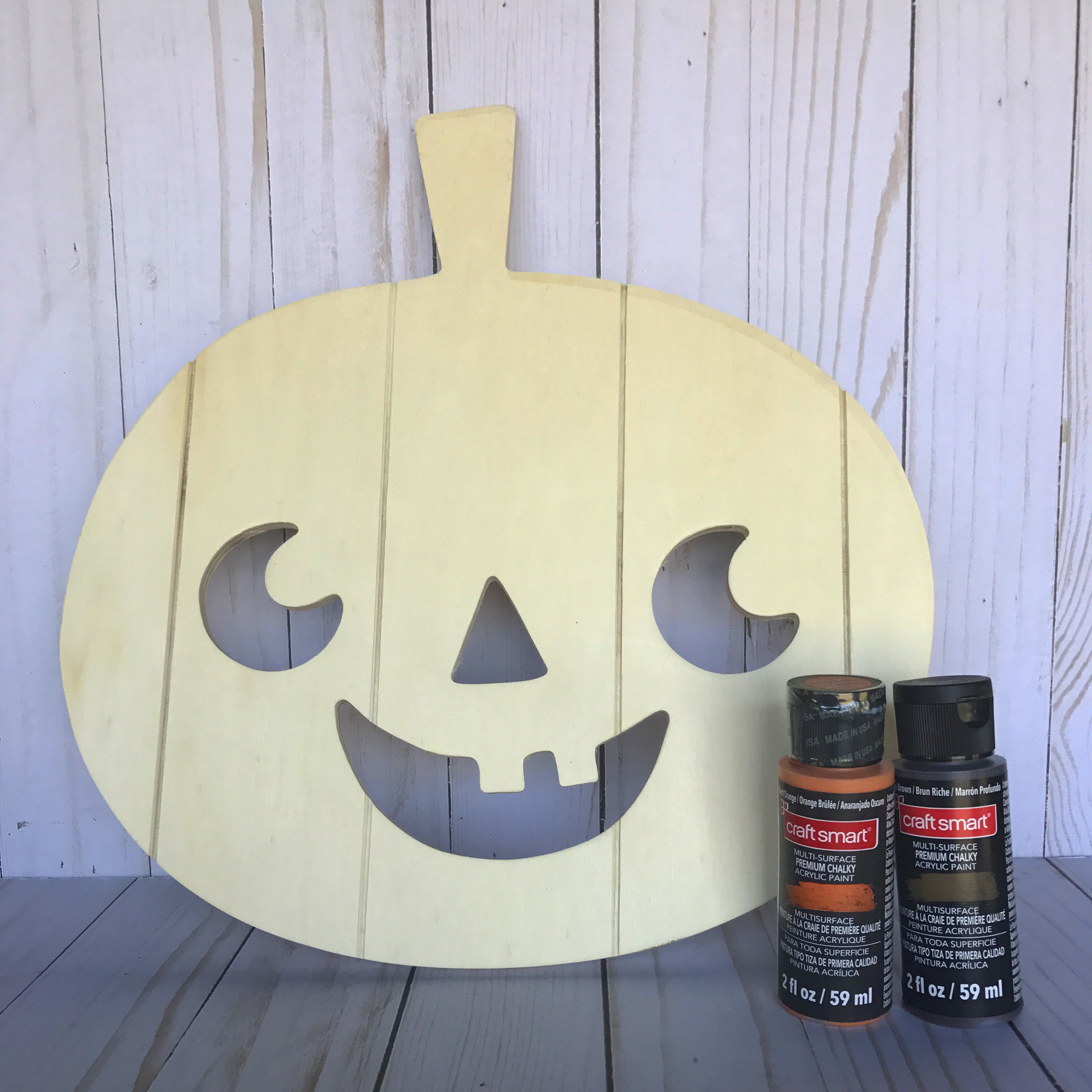 I found this unfinished wood pumpkin plaque in the Dollar Spot at Target for just $3.00 and I fell in love with his cute face! He measures about 12 inches across and 12 inches from the top of the stem to the bottom of the pumpkin. I knew that with a little paint he would make a fun addition to my Fall decor.Â