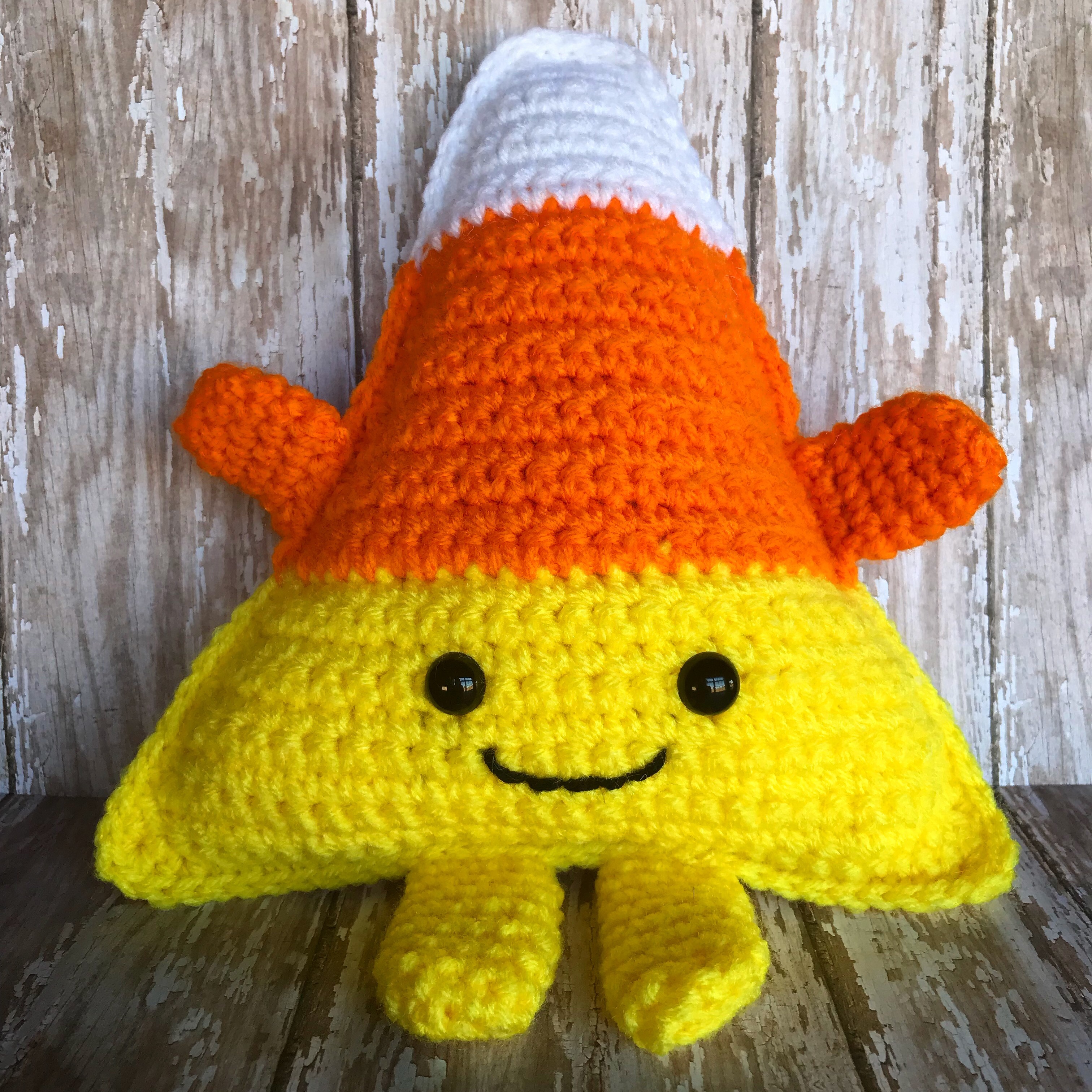 I used Red Heart Super Saver yarn in yellow, orange, and white to stitch up my Cuddly Candy Corn. I used 12mm safety eyes because that’s what I had on hand. I purchased them here at Amazon. He measures about 10 inches tall and 8 inches wide – the perfect size for little hands. You can easily stitch him up in an evening!