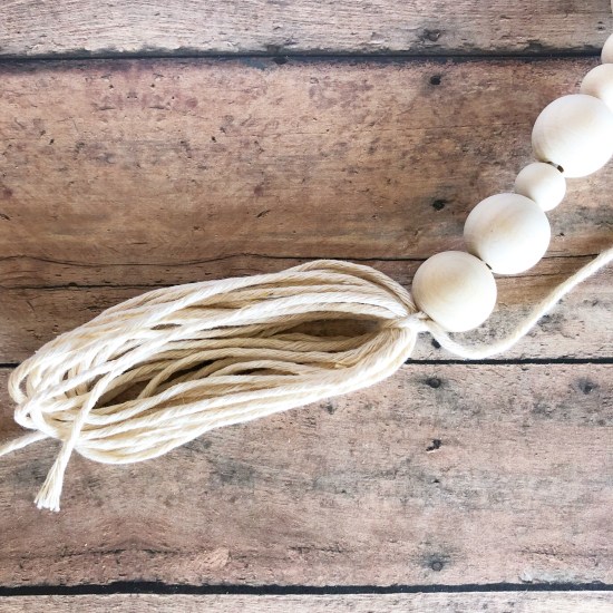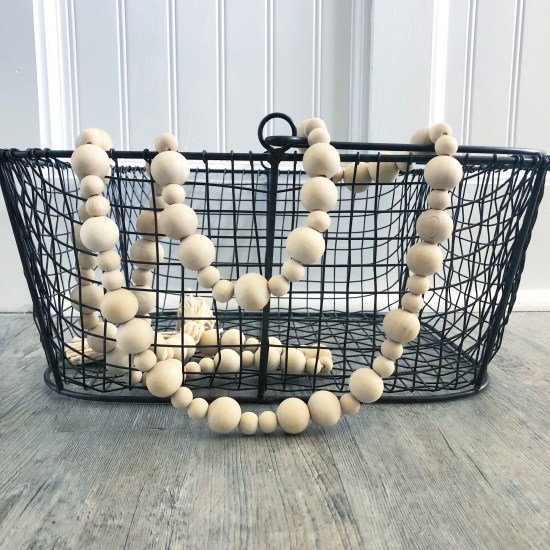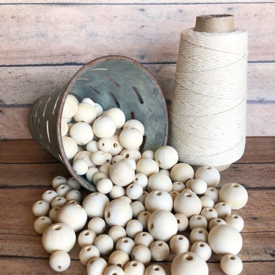 Have you seen the cute Farmhouse Bead Garlands in all the places that sell farmhouse decor? I’ve seen them in colors from natural to white, black, and all colors in between. Some are distressed and some have tassels. There are lots of different types to choose from – or you can make your own like I did!