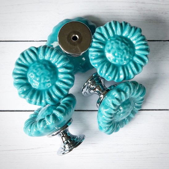 I found these great knobs at Amazon. They come in several colors and are a deal at only $12.99 for 12! They come in several different colors if turquoise is not for you. I love that they are flat on the bottom – I was hoping to be able to glue them onto the wood and these work great! I used clear E6000 glue (also available here on Amazon) to adhere my knobs evenly across the board.