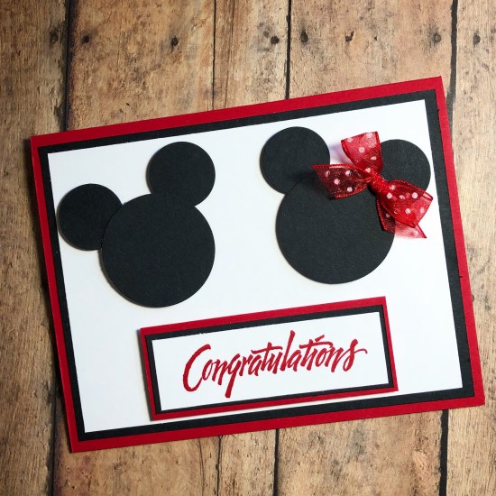 Stamp “congratulations” (or your favorite sentiment) with red ink on white card stock. Layer to black and red card stock and attach to the card with foam tape. Add a polka dot ribbon bow to Minnie.