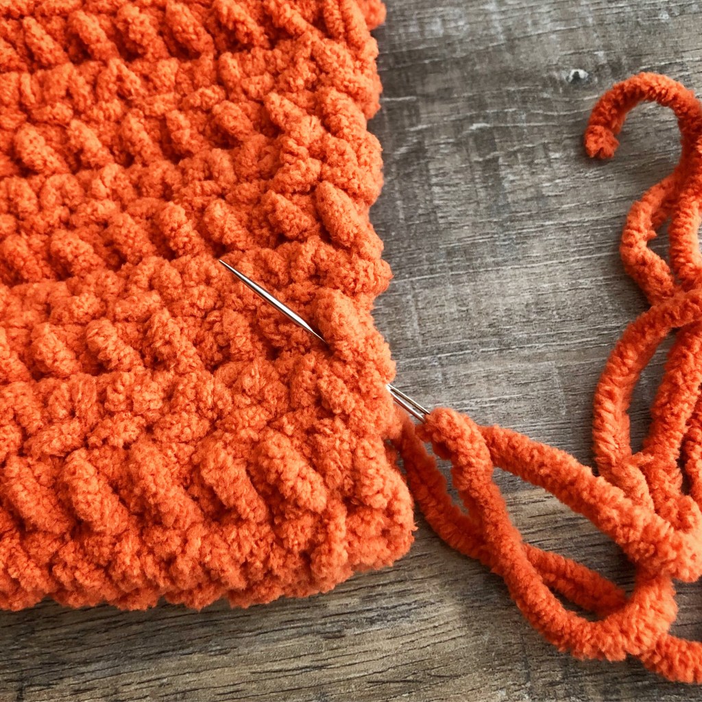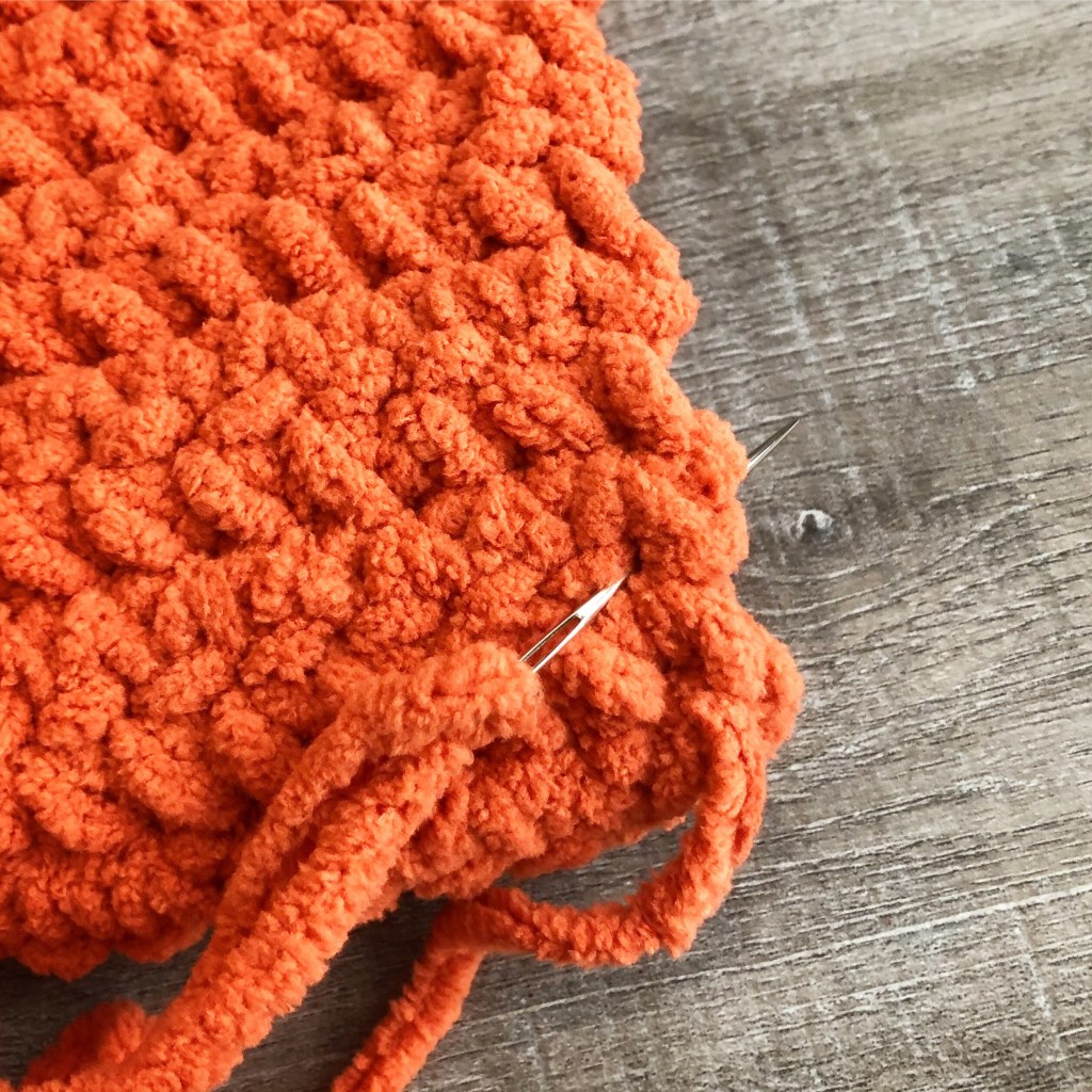 Using a yarn needle and your beginning tail, run a gathering stitch around the bottom of the pumpkin. Pull tight to close the opening, tie a knot, and weave in the end. (Because the yarn is so thick, you may have to sew a couple of stitches across the opening to close it completely.) I forgot to take a picture of this step, but once you have run your gathering stitch just pull on the yarn and it will close your opening.