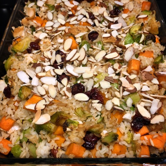 The recipe calls for wild rice, but I only had brown rice in my pantry so I used that and it was quite tasty. I probably should have baked it just a touch longer so the almonds were more toasted and the veggies were more roasted. I’m still getting used to my new oven…