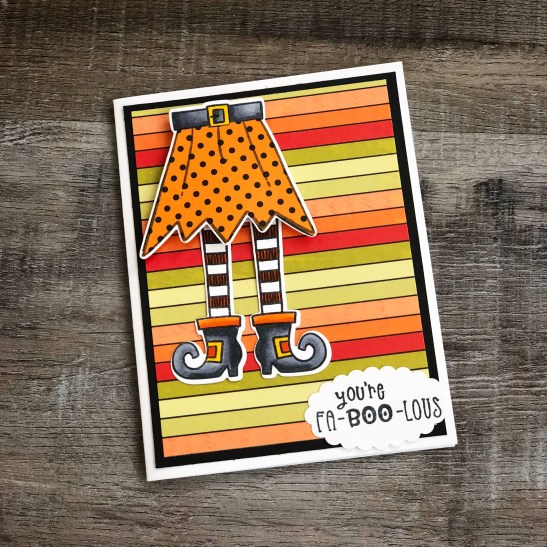 I wanted to share this cute card using some “fa-boo-lous” supplies from Taylored Expressions. I know it’s too late to make this card for this Halloween, but they have a really cute On a Hinge-Merry Stamp and Merry Die Set that uses the same technique – and I’ll bet there will be more fun sets to come!