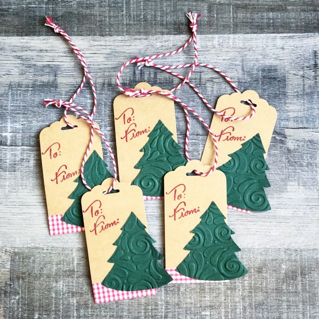 To make your tag, cut a piece of kraft card stock to 4 by 2 inches. Punch or trim the top into a tag shape. Stamp “to” and “from” with red ink on the tag. Attach a strip of red patterned paper to the bottom of the tag. Die cut a tree from green card stock and emboss with a swirl pattern, if desired. Attach the tree to the tag and tie with bakers twine.