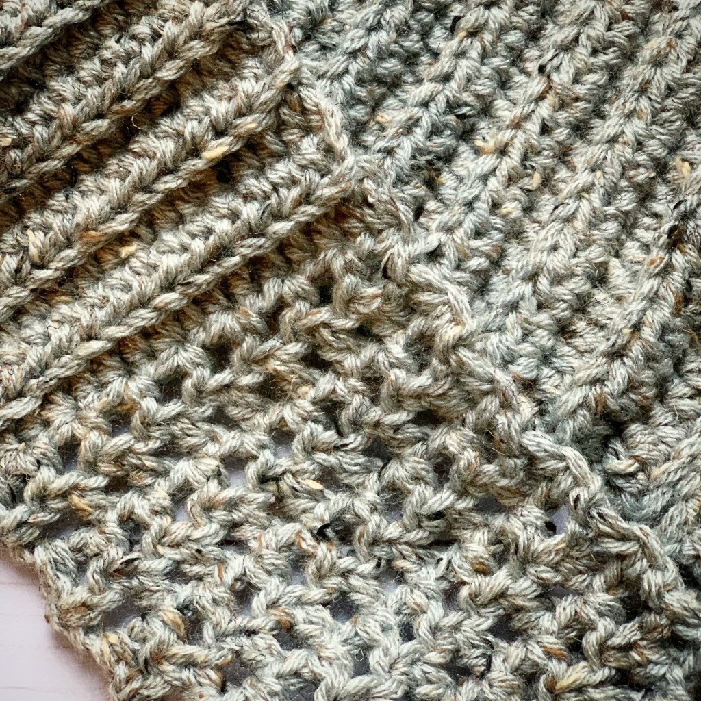 Row 12: ch 3 (counts as 1 hdc and 1 ch). Skip 1st hdc and 1st ch 1 space. Hdc in next hdc. *ch 1, skip ch 1 space, hdc in next hdc* Repeat from * to * across, ending with hdc in 2nd ch of ch 3 from previous row. Turn. (8 ch 1 spaces and 9 hdc)