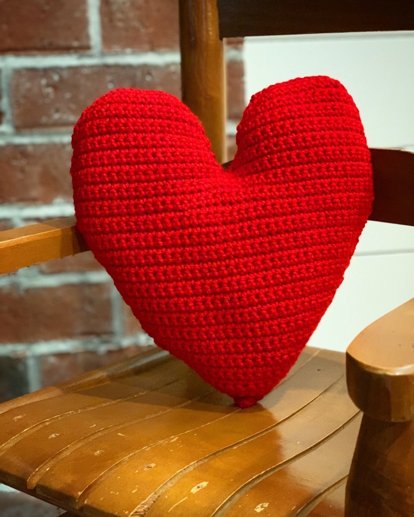 I used I Love This Yarn in Red and a G/4mm hook to make my pillow. It is a a worsted weight yarn so my pillow came out a little smaller than the one in the pattern. It’s about 9.5 inches across by 10.5 inches high. It’s the perfect size to sit on my little rocking chair!