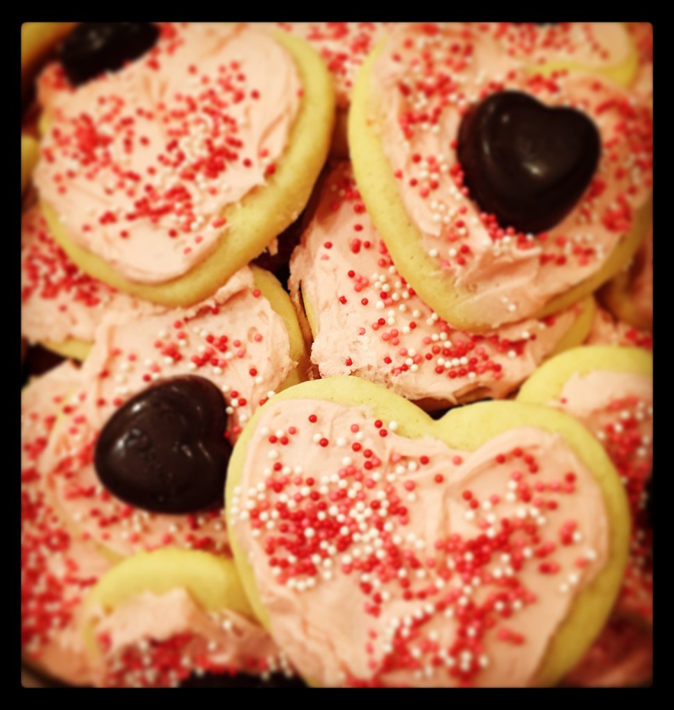 I added a little red food coloring to make the icing light pink for my Valentine cookies. I topped them off with sprinkles and some of them with dark chocolate hearts – because you can never have enough chocolate. 🙂