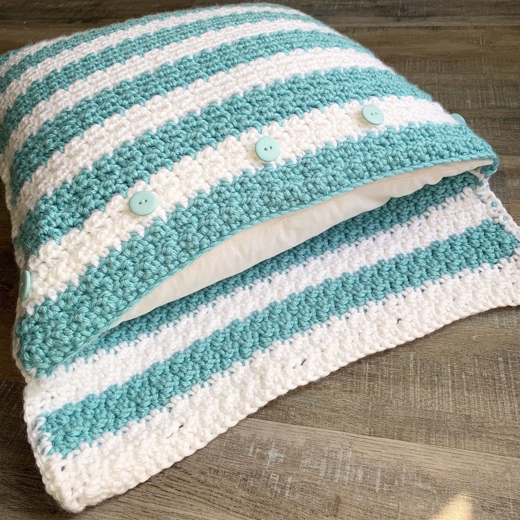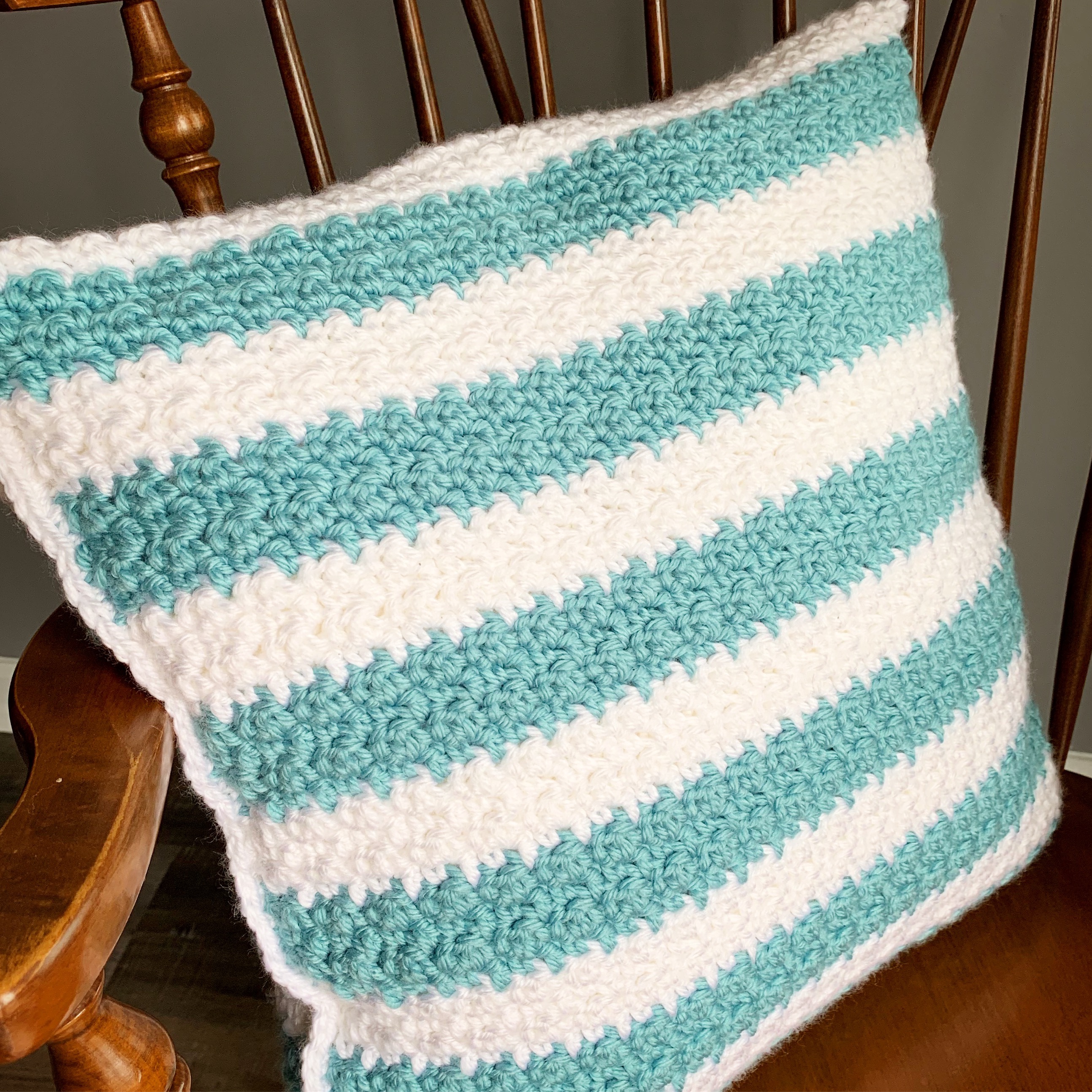 I crocheted my pillow cover using Red Heart Soft Essentials yarn in White and Seafoam and a J/6mm hook. My pillow insert is 18-inches square.