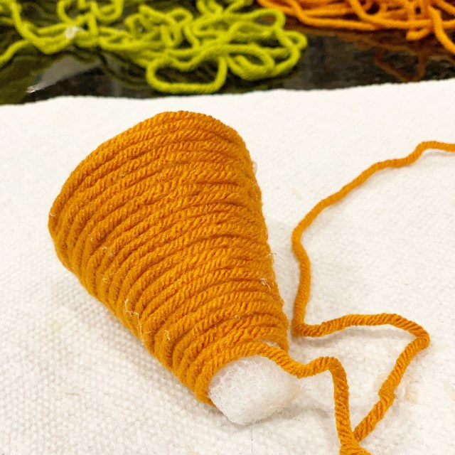 Then continue wrapping the yarn around the cone, using hot glue to secure it. Be careful not to stretch the yarn too much. I put a thin line of hot glue close to the yarn already on the cone, about an inch or so at a time, and carefully placed the yarn on the glue. Be careful you don’t burn your fingers!