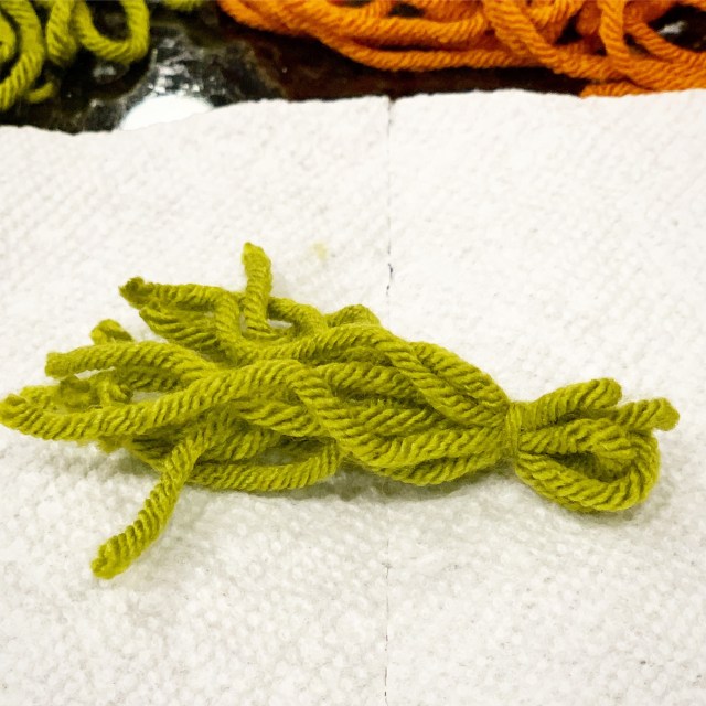 Then take the green yarn and wrap it around your fingers 6 or 8 times. Take another piece of green yarn and tie a knot close to one end of the loops. Cut open the loops at the other end and trim the strands to the length you want. Hot glue the uncut loops to the center top of the carrot.