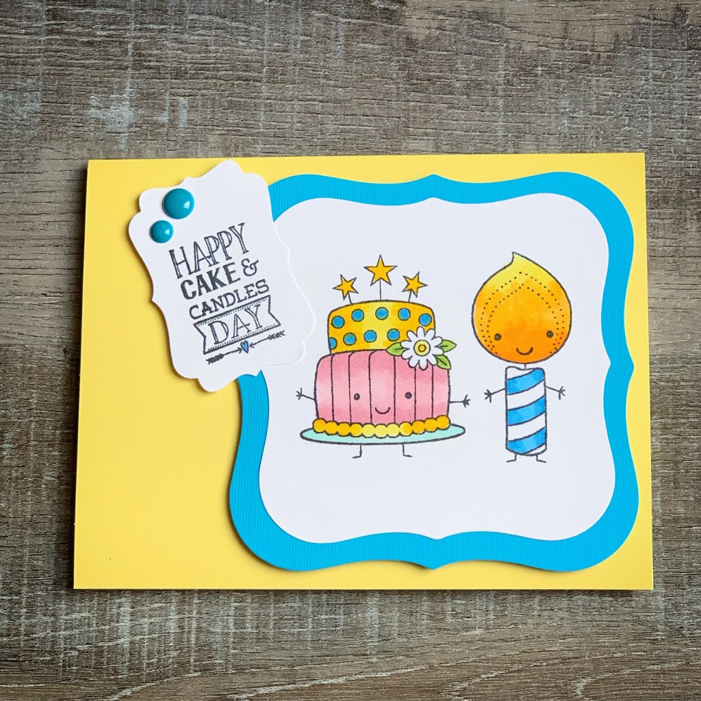 This cute set is called Cake and Candles from Darcie’s. I used this die set to cut out the image. The punch for the sentiment is discontinued but here’s a similar one from Stampin’ Up. I colored the image with Copic markers.