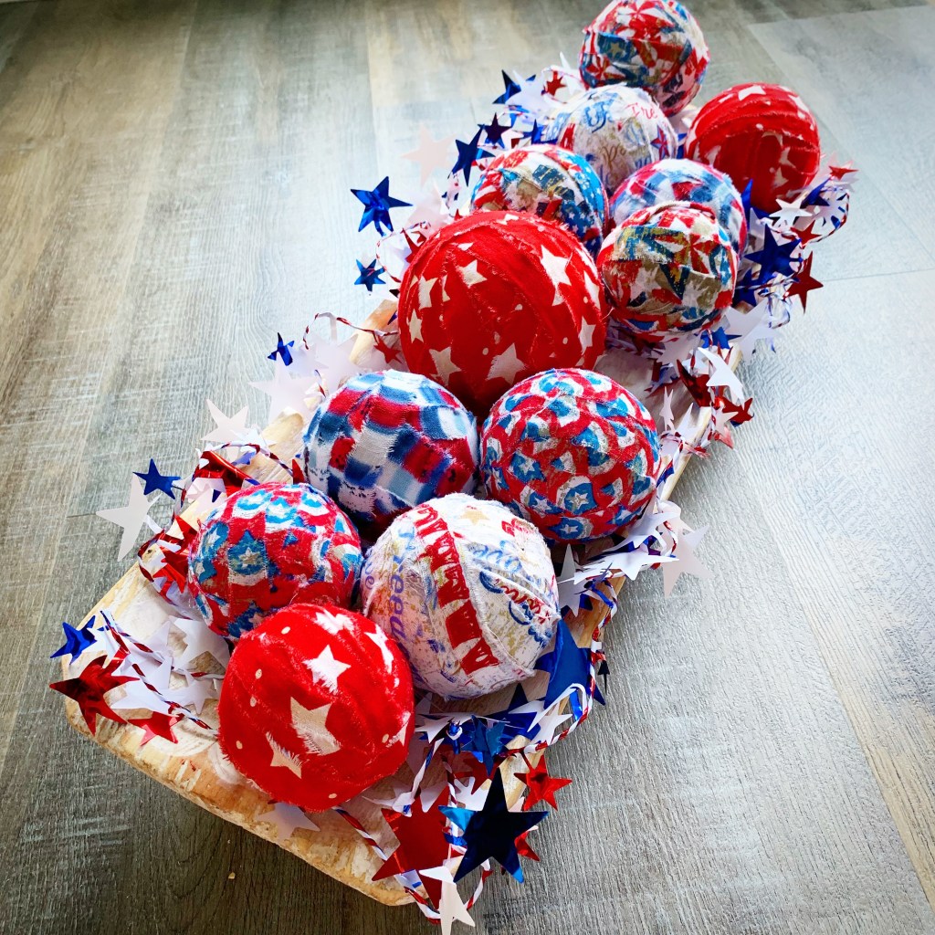 I love the look of decor balls in a clear vase or dough bowl, but they can be expensive! I have an easy way to add some fun Patriotic Rag Balls to your decor just in time for Memorial Day inspired by this pin I found on Pinterest. They are great for your 4th of July decor and all Summer long, too!