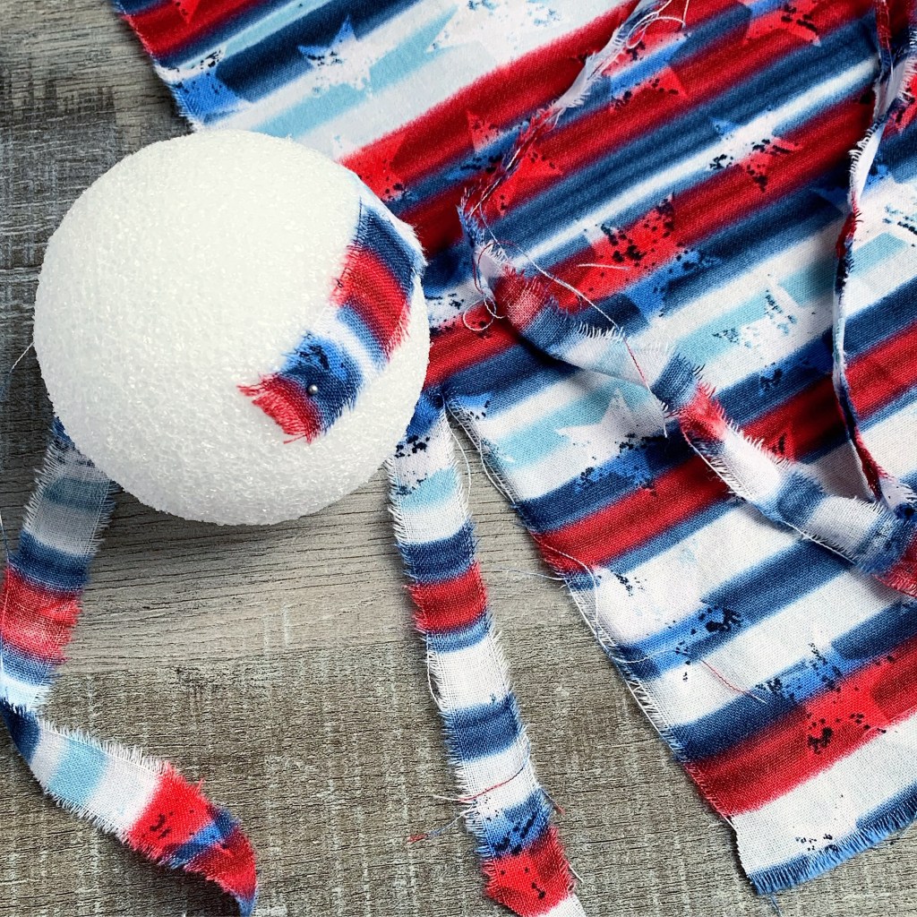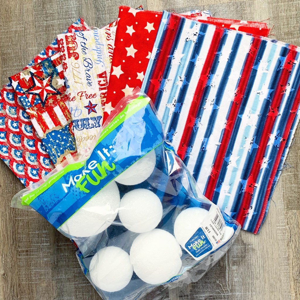 You’ll need several different patriotic fabrics, some styrofoam balls, and straight pins. I found my fabrics in a bundle at Hobby Lobby – each one measures about 18 x 21 inches.
