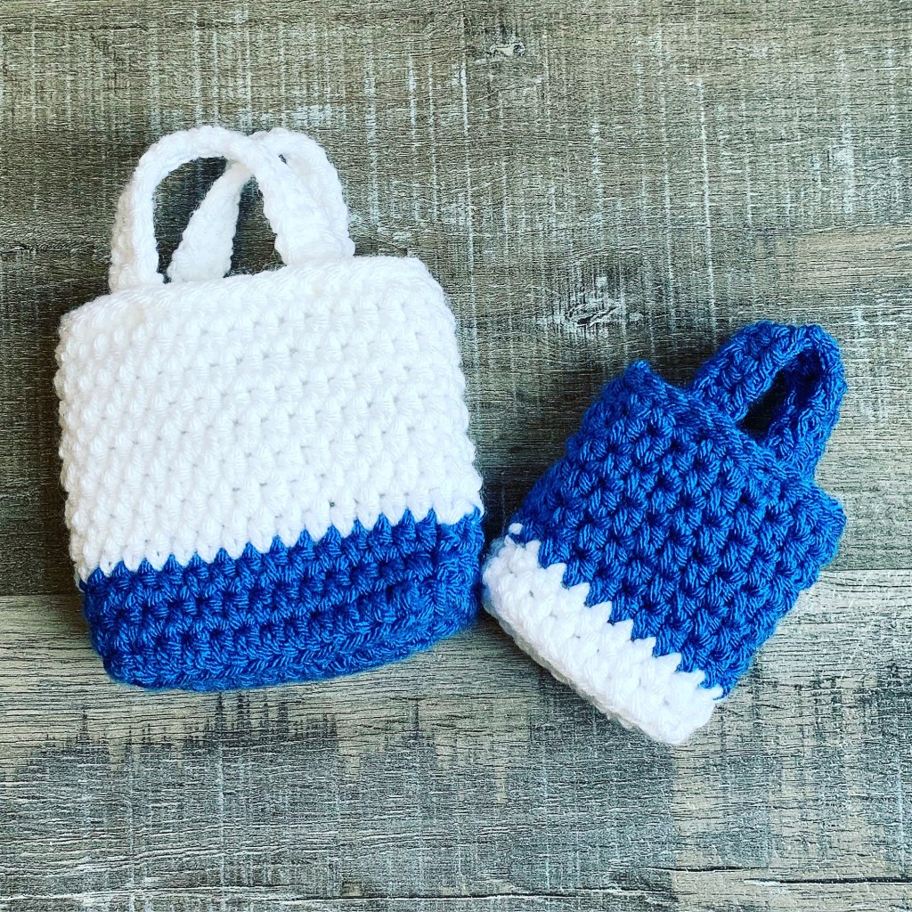 I used Yarn Bee Soft & Sleek yarn in White and Cobalt with a 4.5mm hook to stitch up my gift bags. (The Cobalt color has been discontinued – I got mine on clearance a few months ago – but there is a Teal Blue that is really pretty.) I made the small and medium sized bags – they are the perfect size for a jewelry gift. The small one is also a great size for a gift card or cash gift.