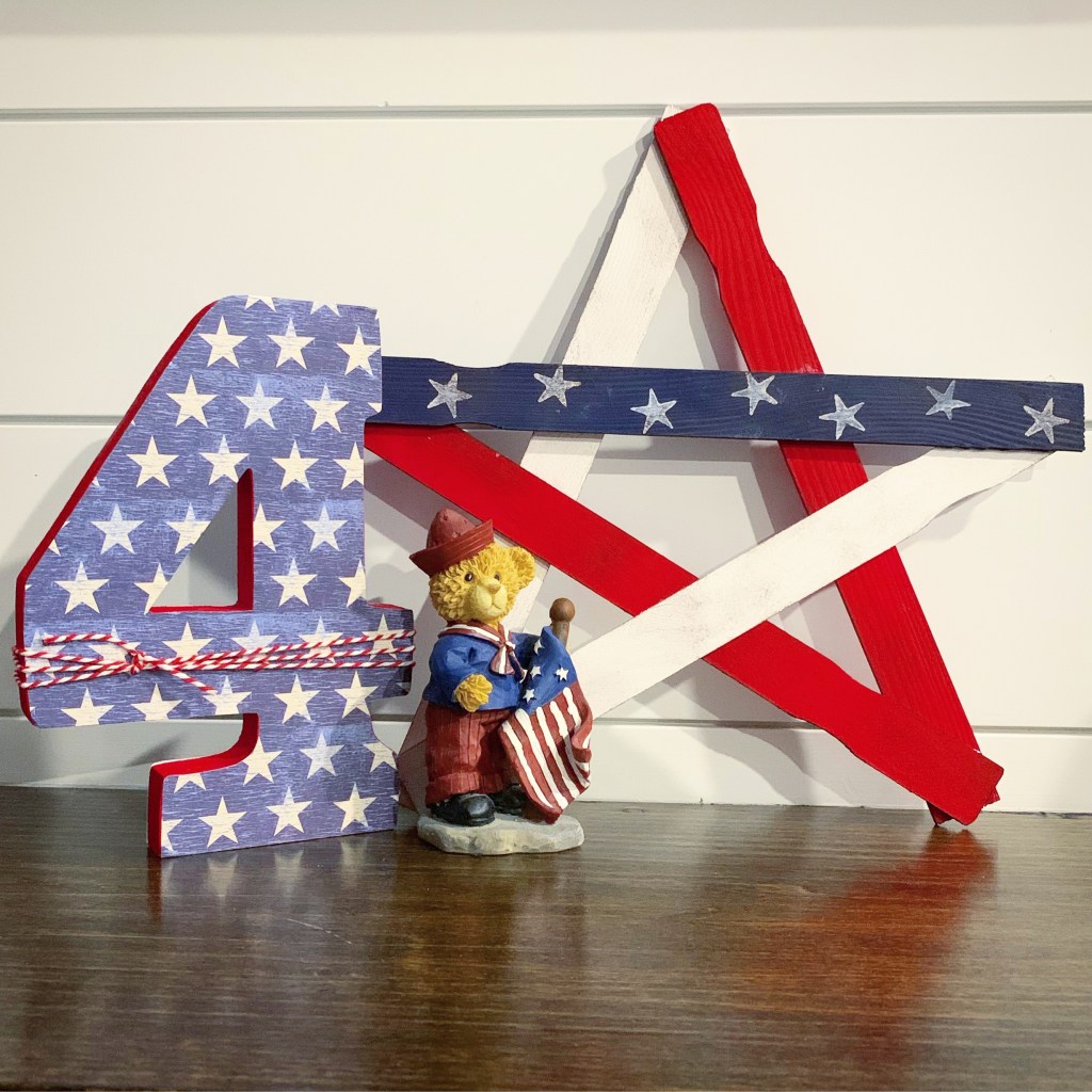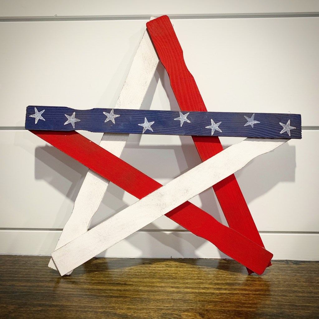 I was inspired by this pin to make a Rustic Patriotic Star, but I wanted to make a smaller version of it. This pin used wood paint stirrers and I knew they would be the perfect size for what I had in mind. So I combined the inspiration from both projects and here’s what I came up with!