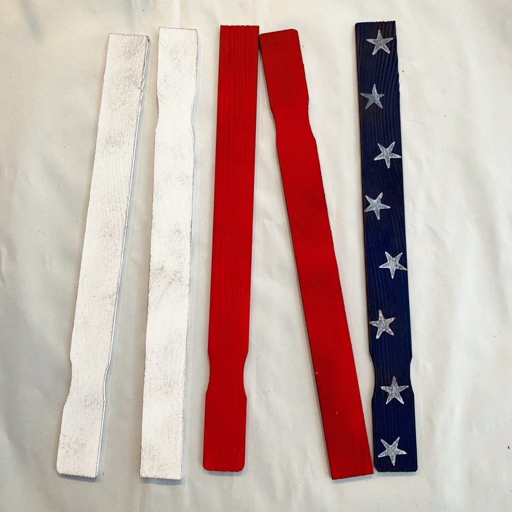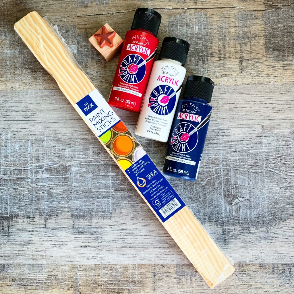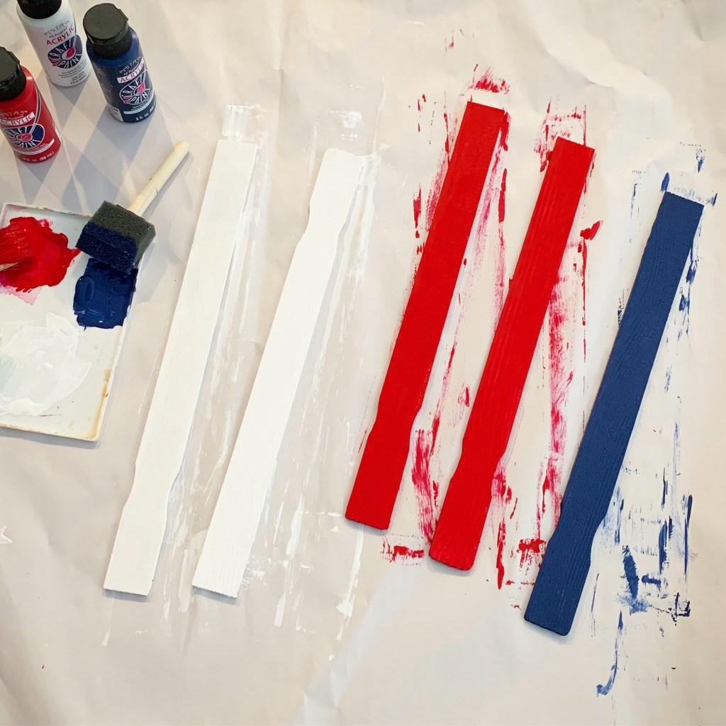 Paint 2 of the stirrers red, 2 of them white, and 1 of them blue. I painted both the front and back along with the sides to give it a more finished look. I painted 2 coats, letting it dry completely between coats.