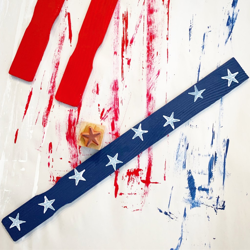 You’ll need some wood paint stirrers – I picked up a package of 10 in the paint department of my local home improvement store. You’ll also need acrylic paint in red, white, and blue, and a star rubber stamp. I used dark brown acrylic paint to add a little distressing to the star, but I forgot to add it to the pic below.