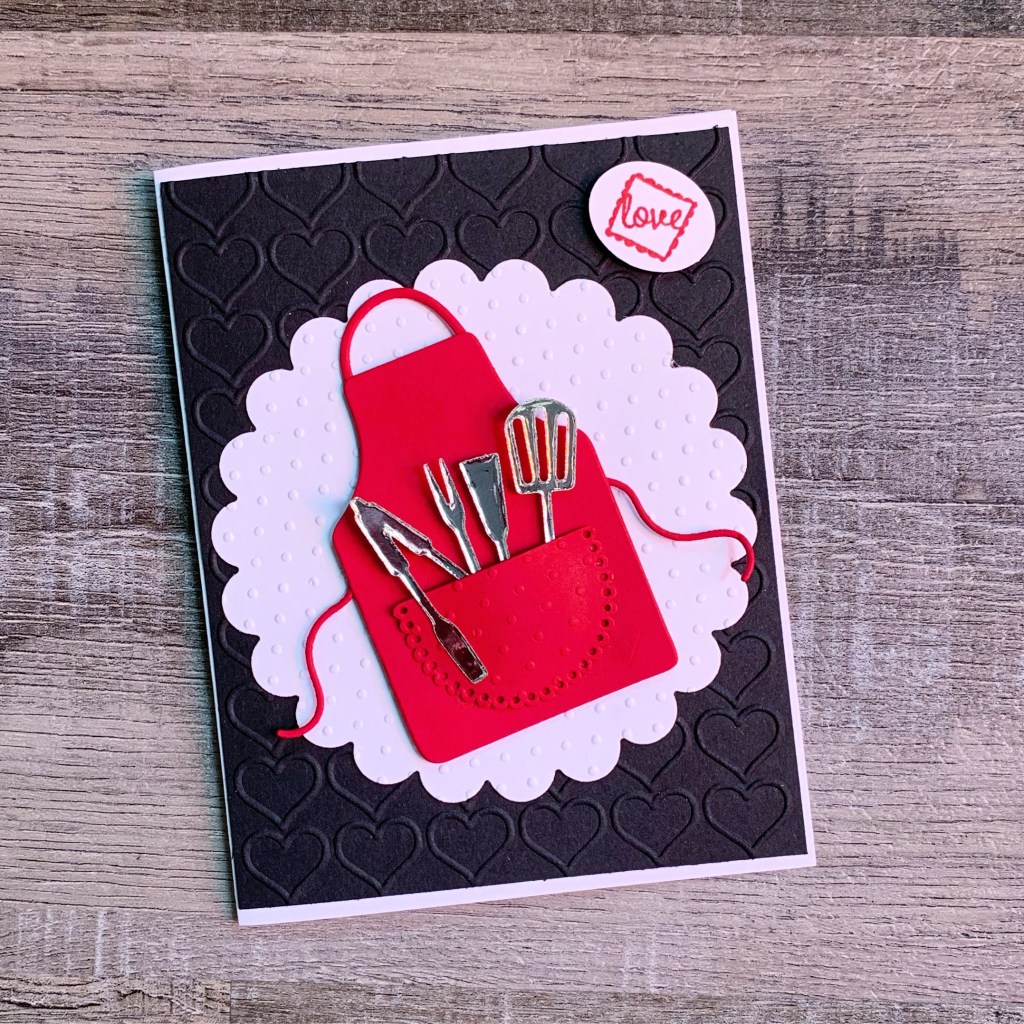 To make the card, I embossed a panel of black card stock with the hearts embossing folder and attached it to a white card. I die cut the apron, ties, and apron pocket from red card stock. I embossed the pocket with the tiny dots folder. I die cut a scalloped circle from white card stock and embossed it with the tiny dots folder. (This is a great set of scalloped circle dies if you are looking for some.) I also die cut the utensils from silver mirror card stock.