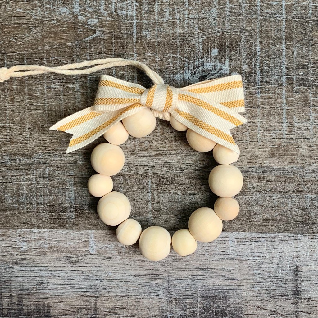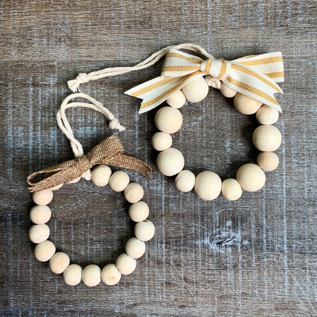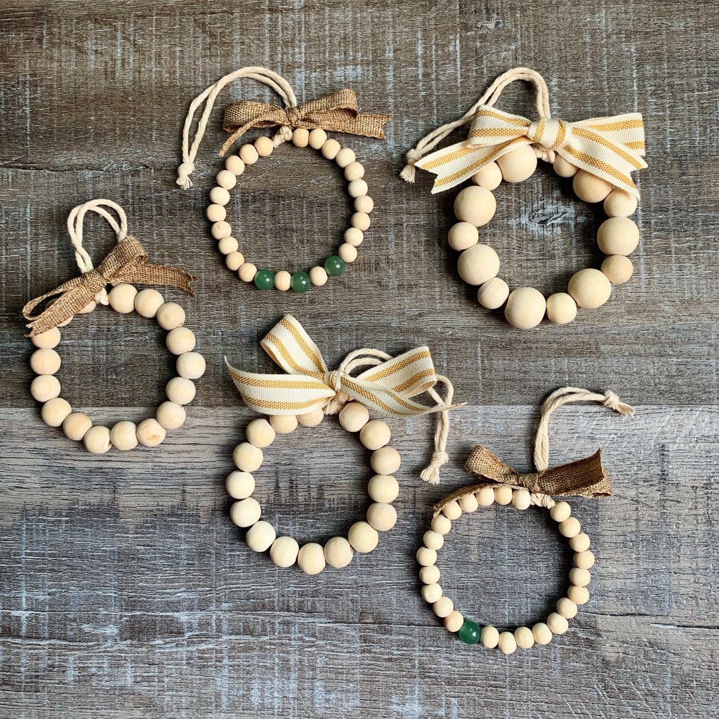 These Mini Farmhouse Wood Bead Wreath Ornaments come together quickly – you can make several in no time at all!