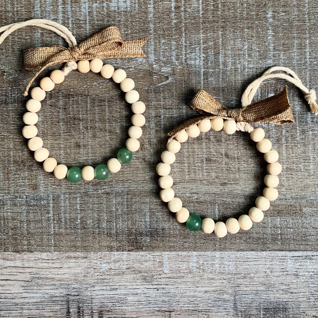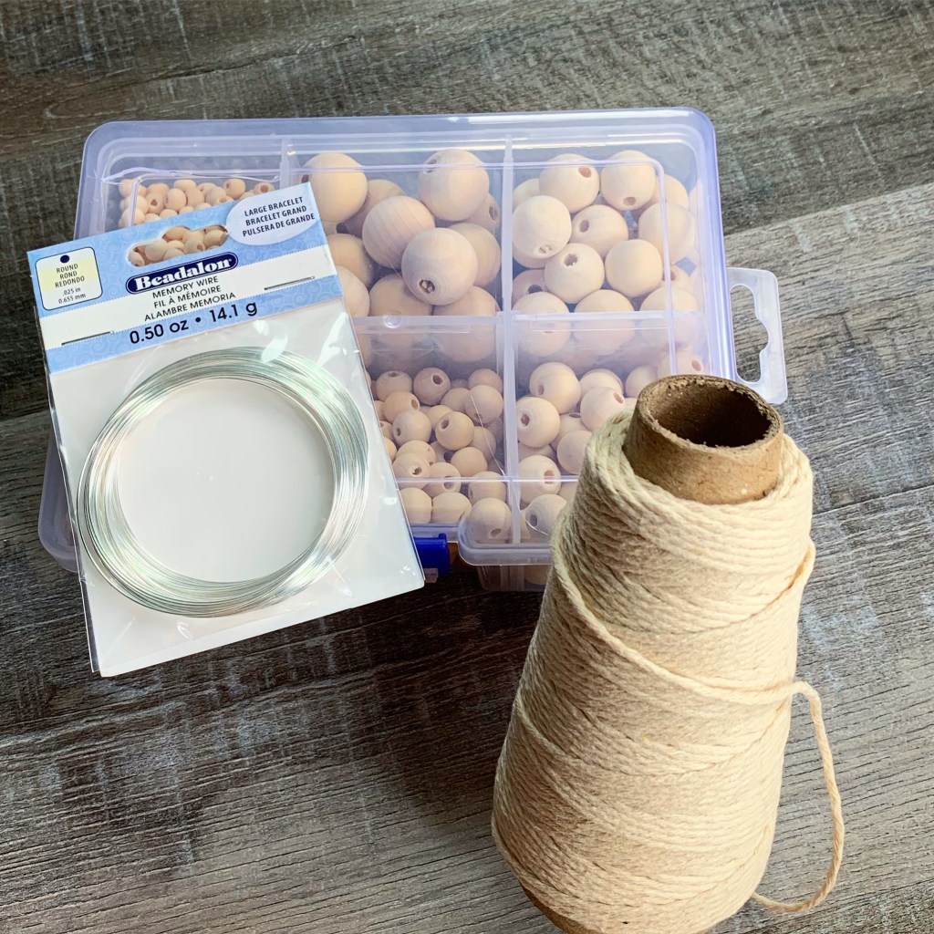 You’ll need some unfinished wood beads – I found this great set with different sizes at Amazon. You’ll also need some memory wire for bracelet making and some natural cotton twine. I added natural stone beads to a couple of my ornaments and tied them with a ribbon bow – both are optional but I like the little something extra they add. π