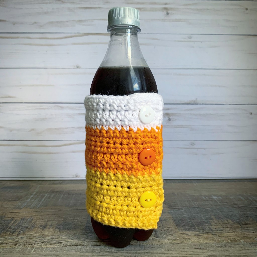 I have a simple Crochet Candy Corn Cozy pattern to share with you today. It’s super easy to make. You can find the pattern here and I’ve included a link to a free PDF if you want to print it out for easy reference.