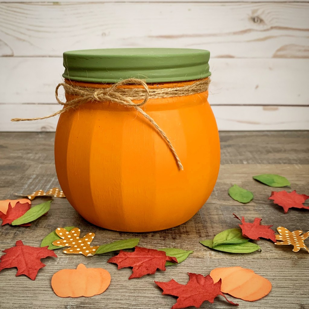 I saw this jar at the Dollar Tree and the first thing I thought was “That looks like a pumpkin”! And since it was only a dollar (of course 🙂 ), I decided to bring it home to see what I could come up with. (My jar had a metal lid, the ones on the Dollar Tree website have plastic lids but they would work fine.)