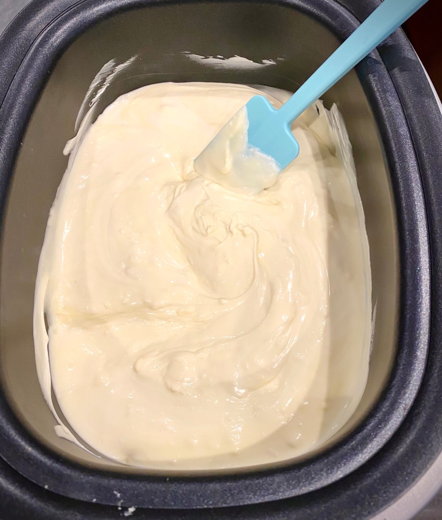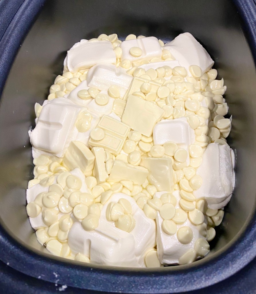You put all the white chocolate goodness in your slow cooker (this is the slow cooker I have and I love it!!) and walk away for an hour! You can go wrap those last minute gifts while you’re waiting for everything to melt. πŸ™‚